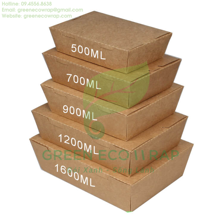 Green Eco Wrap – Giải pháp bao bì giấy & bao bì sinh học cho doanh nghiệp. Ngoài dung tích 2000ml, chúng tôi còn cung cấp nhiều kích cỡ khác như 760ml (có cửa sổ), 1400ml, 1500ml và các loại khay – hộp bã mía.